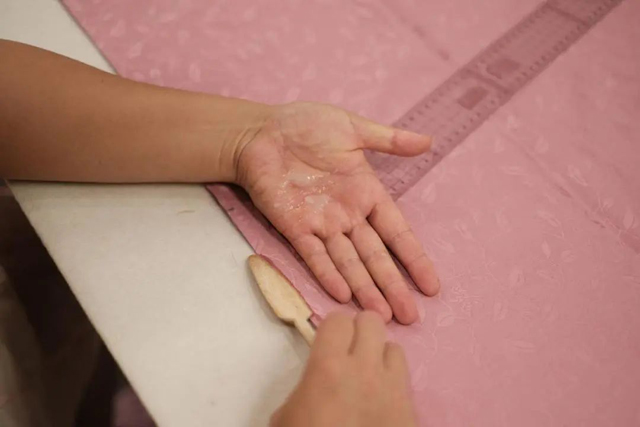今天還解鎖了新的款式——南宋穿枝飛鳥紋圍裹式兩片裙。兩片裙在南宋時期使用十分廣泛,具有顯著時代特色。兩片裙的結(jié)構(gòu)看似簡單,實(shí)則包含了很多以前少有深入討論的問題,如裙片的裁剪方式,穿著的方法。老師還分析了另一款星地折枝花的裙子,并結(jié)合圖像討論了這些問題,大家有了前面的經(jīng)驗(yàn)后,這款裙子的打版就顯得得心應(yīng)手。速度較快的學(xué)員已經(jīng)完成了裁剪和刮漿糊。