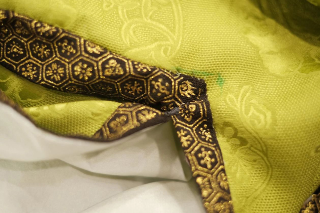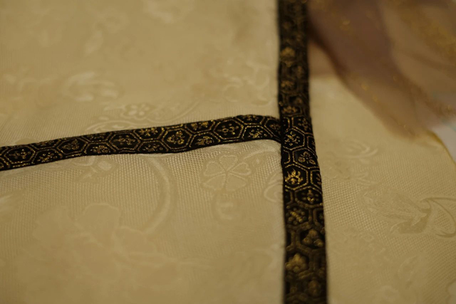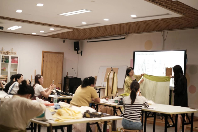 研習(xí)班第四日,學(xué)員們早早來到了女紅傳習(xí)館,繼續(xù)手繰花邊?;ㄟ呄嘟坏奈恢檬强p制的難點(diǎn),大多學(xué)員都感受到了工藝的困難。如何順利地轉(zhuǎn)角和相交,導(dǎo)師和學(xué)員又展開討論,進(jìn)度較快的學(xué)員也分享了自己手縫時的方法和經(jīng)驗(yàn);如何繰縫出工整的線跡和完美的造型,老師分享了一些文物的實(shí)例,演示了一些方法,大家結(jié)合面料的特點(diǎn),開始了各自的思考和嘗試。
