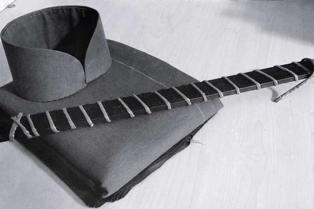 領(lǐng)子需要領(lǐng)襯支撐,當(dāng)代領(lǐng)襯的材料豐富多樣,有樹脂襯、馬尾襯和港式尼龍網(wǎng)襯等,在1950-60年代中國(guó)香港還曾流行使用PVC膠片用作薄紗旗袍的領(lǐng)襯。本次所選用的領(lǐng)襯材料相對(duì)環(huán)保,是使用三層棉布漿在一起而成的“袼褙”領(lǐng)襯。