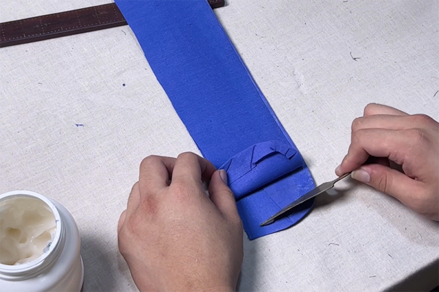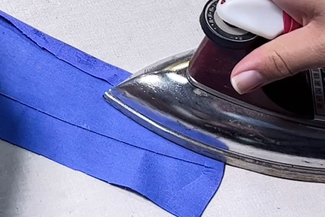 6、裁下領(lǐng)里布,并包轉(zhuǎn)扣燙在領(lǐng)面布的縫份之上,但是不可對(duì)齊,應(yīng)稍稍低于領(lǐng)位線,優(yōu)先扣燙領(lǐng)子水平區(qū)域的領(lǐng)里布,并刮漿、燙干。