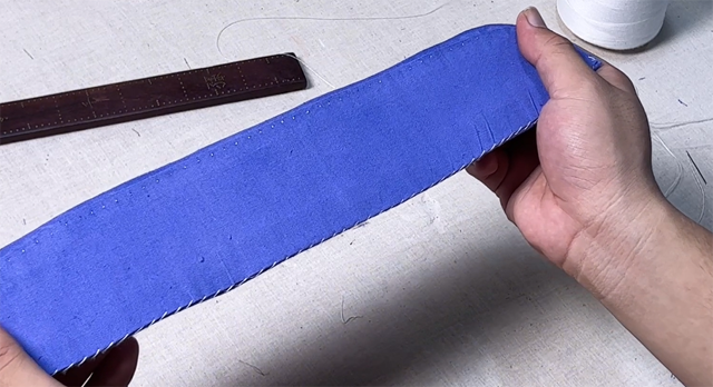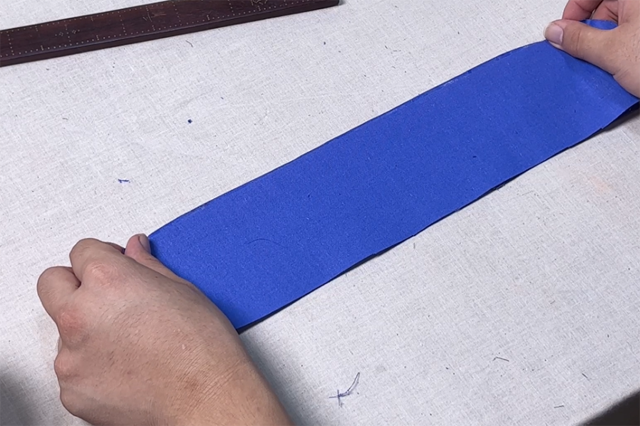 7、扣轉(zhuǎn)兩邊弧形領(lǐng)里布,此時(shí)可稍稍將領(lǐng)里布扯緊一些,使得領(lǐng)子更具有抱脖效果。