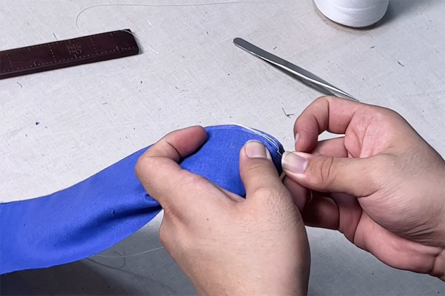 8、穿針雙股線,從領(lǐng)子一側(cè)起針,按照星點(diǎn)縫倒鉤針的針法將領(lǐng)里布鉤縫在領(lǐng)面與領(lǐng)襯上,注意此時(shí)針線盡量挑到領(lǐng)襯上,會(huì)略硬,可搭配鑷子的尾部夾住拔針,會(huì)更加省力些。