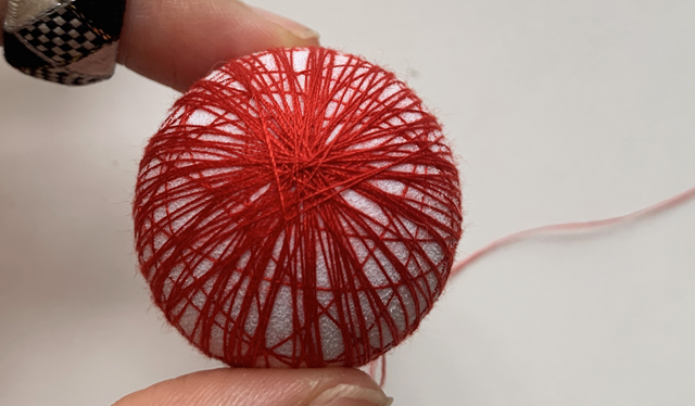 1.2 如圖所示,纏素球就是亂亂的纏就好,越?jīng)]有規(guī)律越好,如果用泡沫球就是直接纏就可以了,如果是用棉花或者干花,那在纏的過程中注意不要太大力度,力度過大反而不容易把球纏圓。