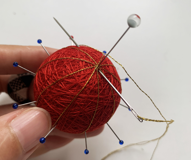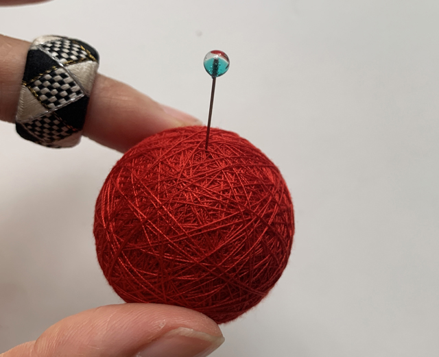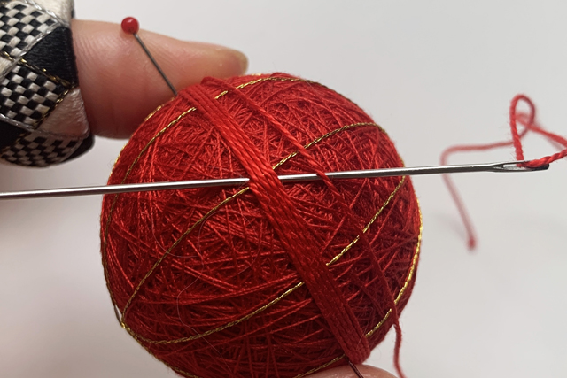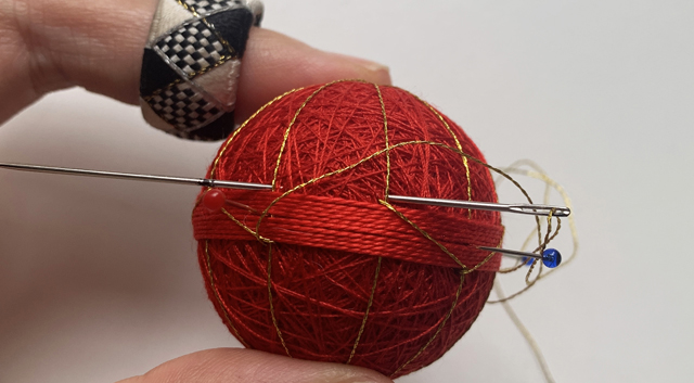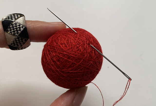 2.7 開始拉分球線,手鞠球一般不打結(jié),我們?cè)谡介_始之前,先在球里來回走2針,以此來固定線頭。