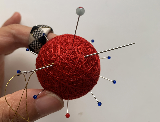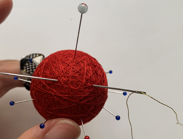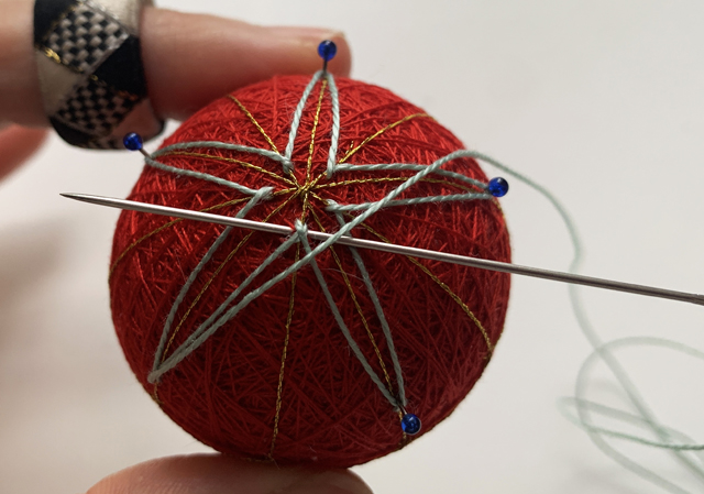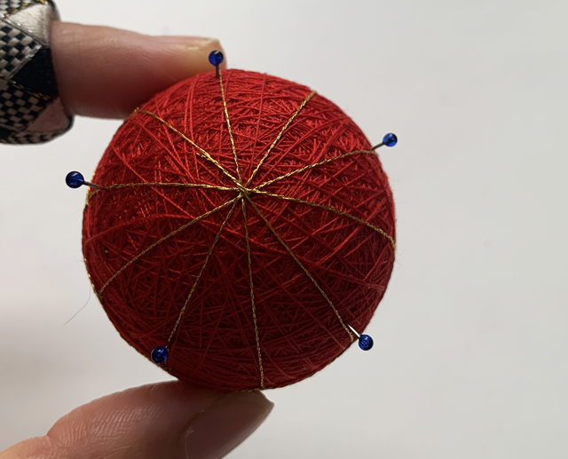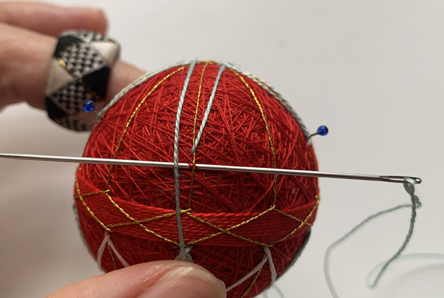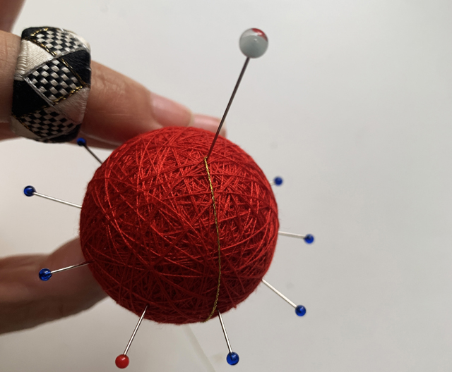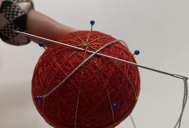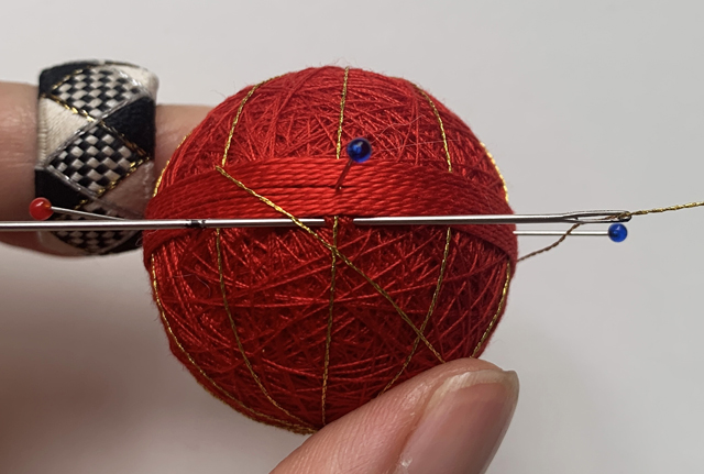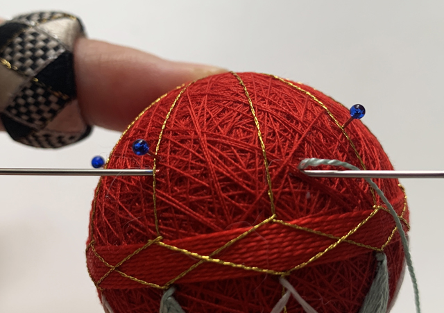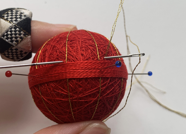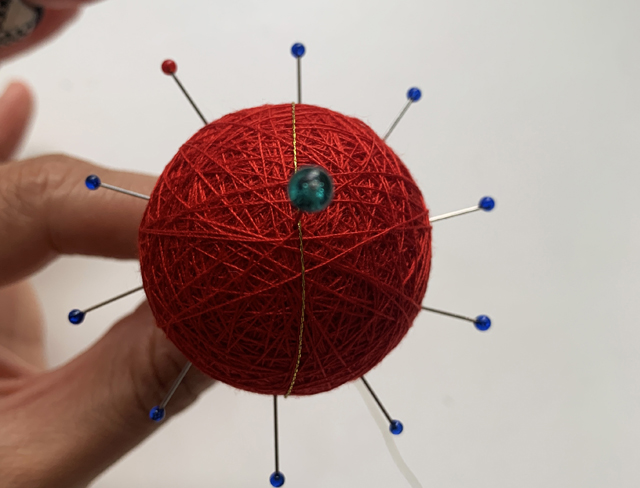 2.16 另一個(gè)角度拍的,從能看見定位針根部的象限入針固定第1極點(diǎn),固定好,則第二步,拉分球線完成。
