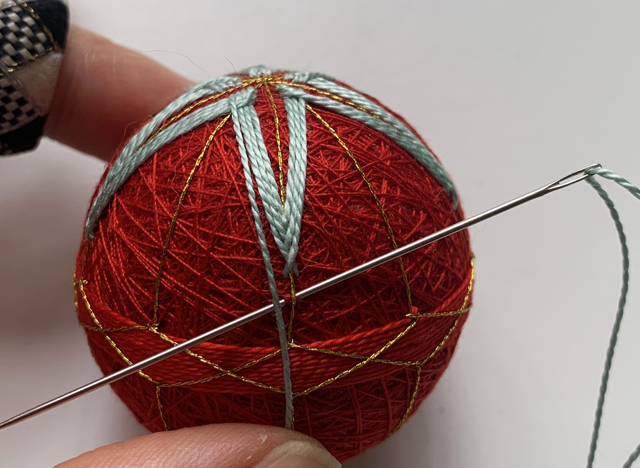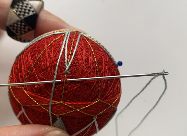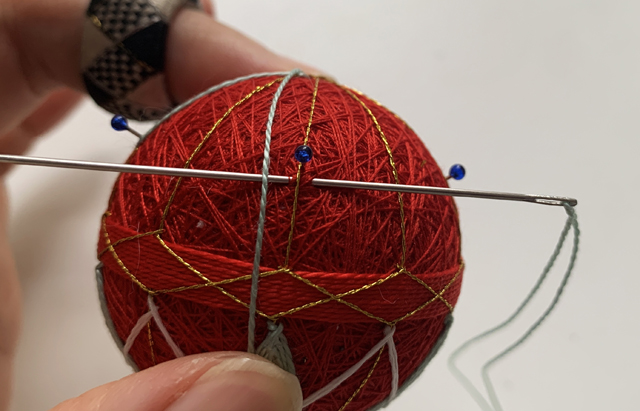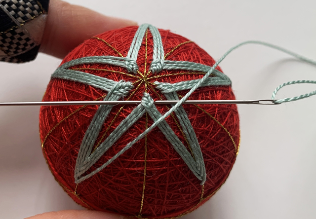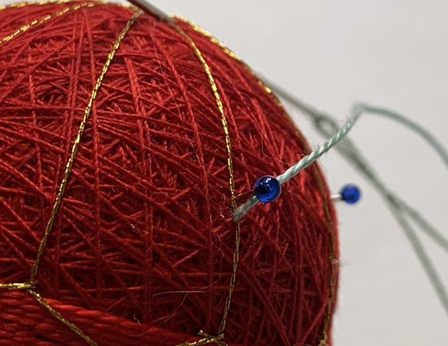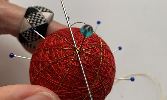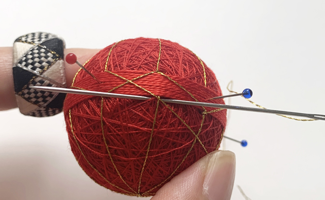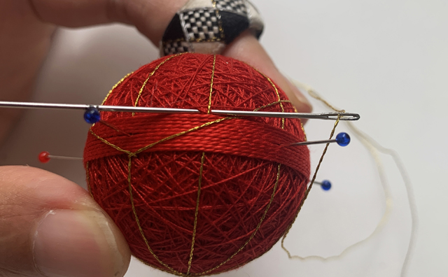 2.15 起點(diǎn)的第1頂點(diǎn),從能看見定位針根部的象限入針,找對(duì)位置1次即可固定,如果無法1次固定,那在此處多固定幾次也是可以的,能做到不要讓分球線散開即可。