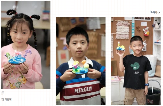 繅絲體驗(yàn)過后,小朋友們利用蠶繭和其他輔助材料制作立體蠶繭畫,每個(gè)小朋友都發(fā)揮自己的想象力,制作出一個(gè)個(gè)獨(dú)一無(wú)二的作品。