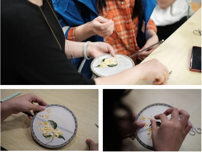 10月5日,杭繡非遺代表性傳承人潘曉穎老師向大家分享了刺繡文化以及杭繡工藝。潘老師現(xiàn)場(chǎng)演示分線、穿線、引線…學(xué)員們仔細(xì)觀摩,親手實(shí)踐,在垂眸凝神于一針一線之間感受蘊(yùn)藏在小小銀針和細(xì)線中的奇妙,領(lǐng)略刺繡的獨(dú)特魅力與韻味。