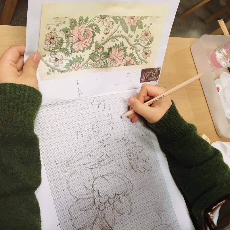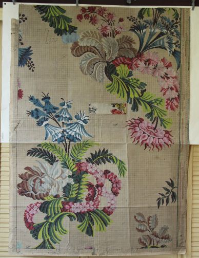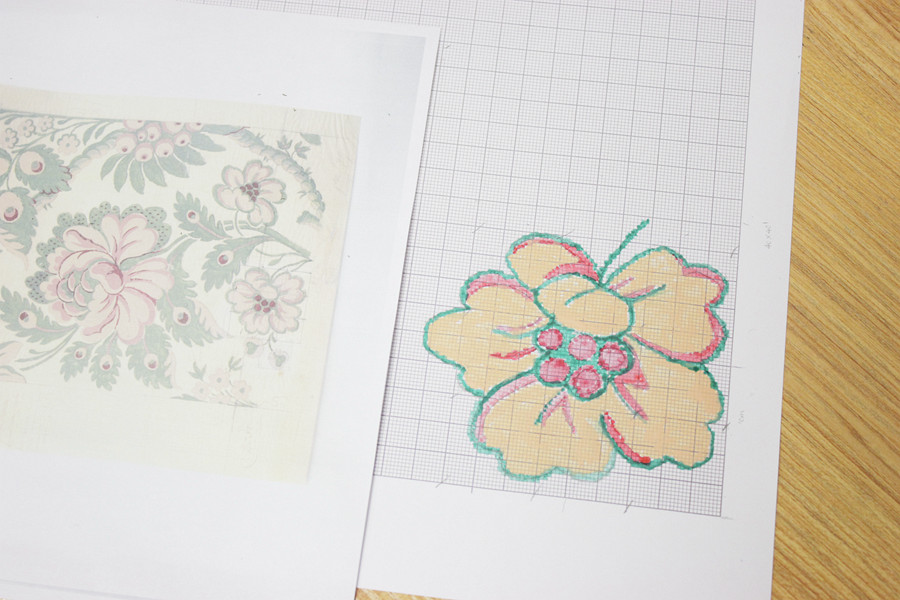 在絲織工廠中,當設(shè)計師創(chuàng)作好了織物的圖案,意匠繪制就要登場啦。此次我們選用了“榮歸錦上”展覽中的一張法國絲織物設(shè)計稿作為樣板供大家學(xué)習(xí)。