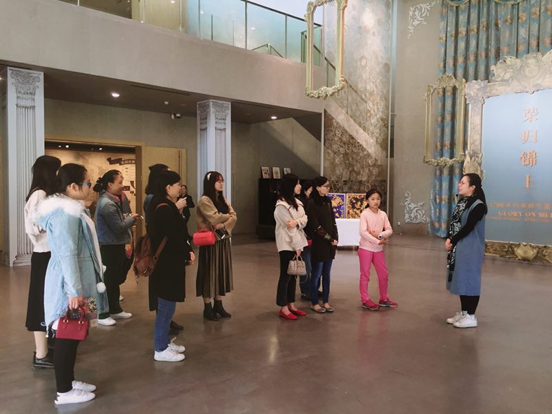 在“榮歸錦上”展廳中,魯老師為學(xué)員們講解了意匠的基本知識,大家也欣賞到了各類精美的法國花卉類題材的意匠稿。下一站,學(xué)員們將前往中絲博絲路館,了解另一類題材 — 像景織物的意匠稿。