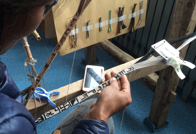 邢振答:我來自山東,在山東西南地區(qū)有一種紡織類國家級非物質(zhì)文化遺產(chǎn)叫魯錦。學(xué)習(xí)織布后,我想更多了解魯錦的制作工藝,也嘗試自己制作織布機(jī),并進(jìn)一步了解4綜織布機(jī)的操作。剛開始接觸綜板織的時候,我想當(dāng)然認(rèn)為小小的卡片做不了什么。但記得上次離開工作坊回家途中,我在動車上完成了第一條織帶。綜板織的可移動性已經(jīng)完勝各種織布工具。后來有機(jī)會在杭州纖維藝術(shù)三年展的時候去中國美院,參觀挪威的藝術(shù)家的卡片織工作坊,又看到他們利用卡片翻轉(zhuǎn)、移位等技術(shù)進(jìn)行設(shè)計創(chuàng)作,諸多變化很有啟發(fā)。
