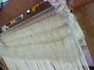 這時候不得不感慨古人智慧之偉大,他們把“綜”對于經(jīng)線的控制交給其他材料來處理,出現(xiàn)了劃時代的重要概念——花本。需要做變化的位置,經(jīng)線仍然被一一挑起,只不過挑的線不再穿過笨重的綜架,而是竹條,甚至更輕的線。目前常見于廣西的竹籠機就是用竹絲竹條記錄挑花位置的。老撾現(xiàn)在也能找到用線編成簾狀的花本,兩者無論是竹還是線,都依然是經(jīng)線處理,只不過媒介不同而已。