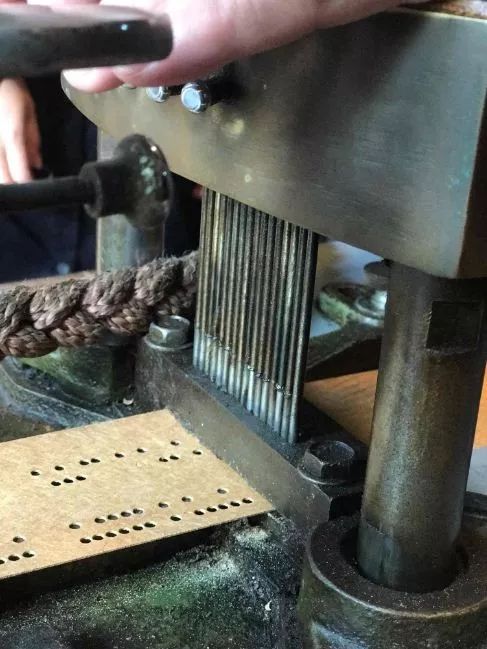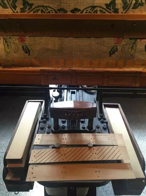 打好孔的卡片,一張代表一個緯向單元經(jīng)線的控制。一張一張的卡片按順序排在一起被帶鉤的“籠頭”讀取,鉤子隨即從有孔的位置提起經(jīng)線,和之前的束綜完全是一個道理。然而,從綜線到卡片簡直是一個質(zhì)的飛躍!在此之前靠人工提拉,不但有出錯的可能,花本數(shù)量也有限,這就影響了紋樣的大小和織造效率。有了卡片以后,至少在提花步驟上不再有出錯的可能,卡片理論上可以無限增加。