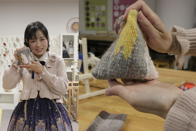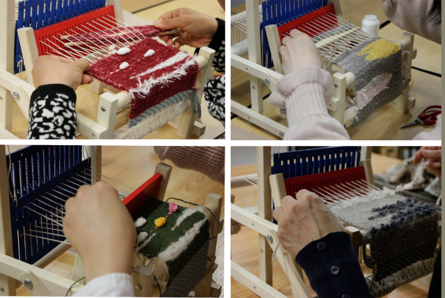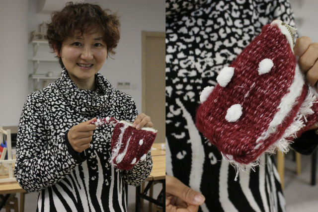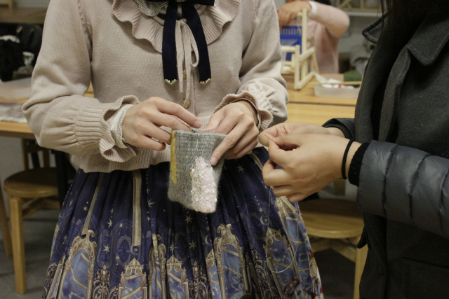 這次織機課堂的任務是:選擇4種羊毛線在迷你織機上學習用3種編織方式組合完成一塊面料,然后手工縫制成一個粽子包。對于我這種女紅僅限于會釘扣子的人來說,開始還是有點擔心自己笨手笨腳的。傳習館的老師不僅心靈手巧,而且和藹可親,手把手一對一輔導,讓只在電視上看過織機編織的菜鳥們迅速進入了角色??粗约嚎棛C上的小布一點點變長,成就感也一點點增長!在這次織機課程中,大家學到了如何織平紋,如何用不同顏色、材質(zhì)的線作出紋樣。技巧雖簡單,變化卻無窮,每個人的織布都獨一無二、各有各的美麗。