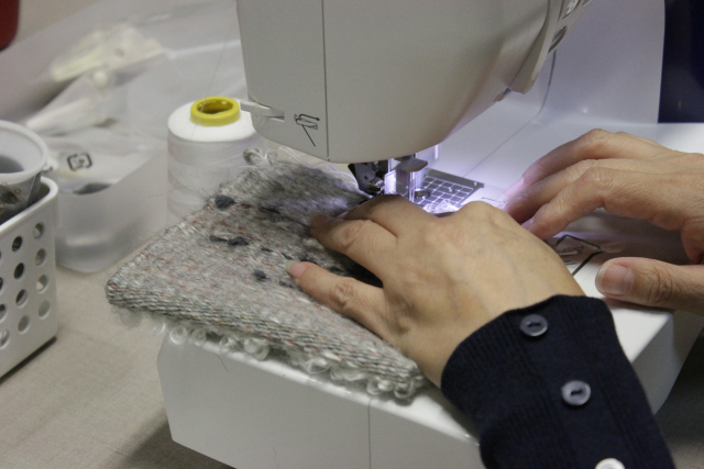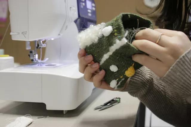 使用縫紉機將剛剛織出的面料縫合起來