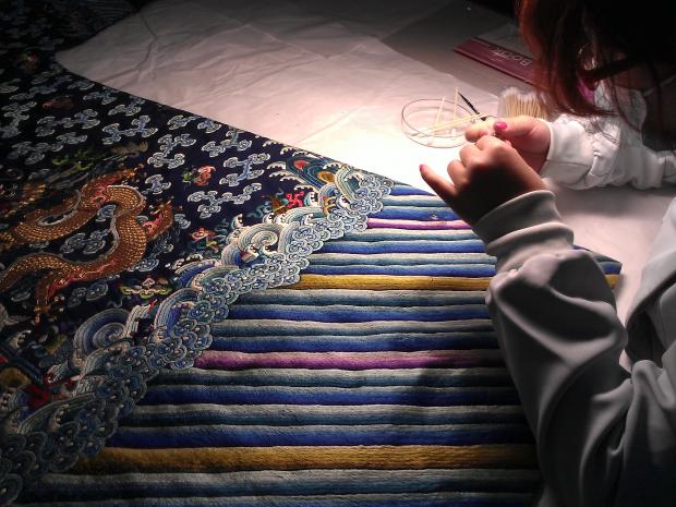 Researchers from the China National Silk Museum in Hangzhou preserves silk. (Photo: Karin Margarita Frei)