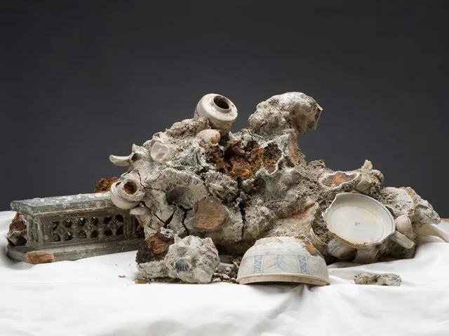 By tracing the pathways of these objects, f<a></a>rom Vietnam to the ocean floor to San Francisco, the exhibition raises the question of how artworks enter museum collections. The show’s centrepiece alludes to the fate of artefacts left in the sea. A grey stone protruding with ceramics a<a></a>nd other artefacts was once covered in barnacles. Now, the mound, known as a concretion, is slowly disintegrating, revealing the objects hidden within—among others, a Chinese coin, a pair of deer antlers a<a></a>nd the remains of sea creatures—as it crumbles.