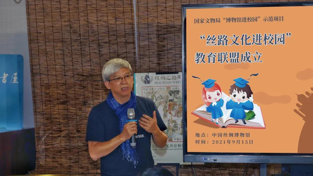 中國絲綢博物館黨總支副書記周旸介紹了“絲路文化進(jìn)校園”項(xiàng)目的相關(guān)背景、工作開展,并展示了階段性成果。