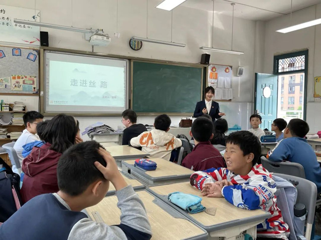 走進(jìn)絲路的主講老師是官琴,她以絲綢之路大地圖引入,介紹四條絲路及絲路上重要的城市,并讓同學(xué)們在地圖上找到相應(yīng)的國家和地區(qū)。通過介紹中國絲綢博物館藏的絲路文物,講述其背后的故事,帶同學(xué)們領(lǐng)略多元包容的絲路文化,理解絲綢之路的發(fā)展歷史與絲路精神。