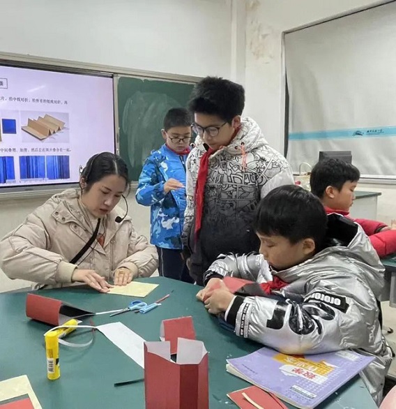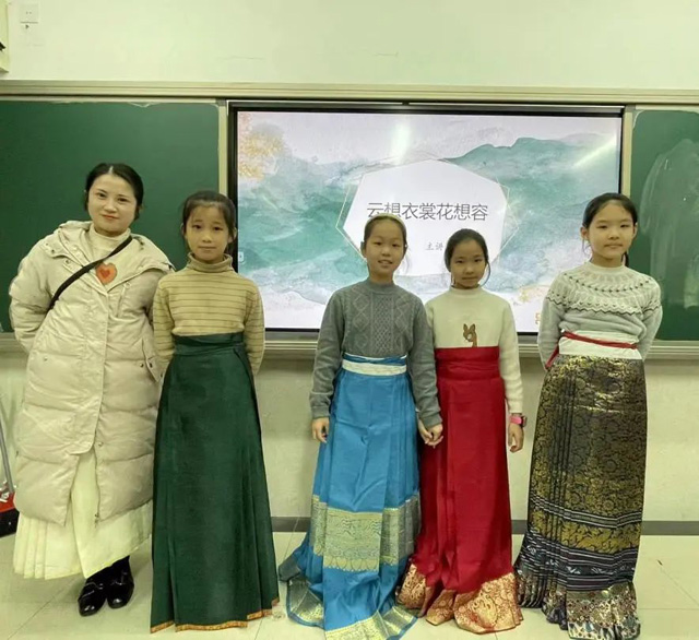 云想衣裳花想容的主講老師是鐘紅桑,她以服飾相關(guān)傳統(tǒng)文化為主要內(nèi)容。圍繞國絲漢服節(jié),向?qū)W生講述漢、晉、唐、宋、明五個時期的服飾變化,最后著重講述明代女性補(bǔ)服,學(xué)生們通過明代紙衣的手工體驗(yàn)感受傳統(tǒng)服飾剪裁制作的精妙。