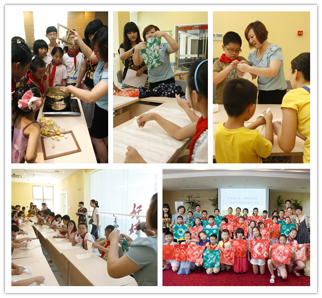 這個愉快的下午,小朋友們忘記了窗外的酷熱,但知道了一顆蠶繭可以抽出一千多米的絲,了解了白色絲綢如何變成色彩風格獨特的扎染作品。