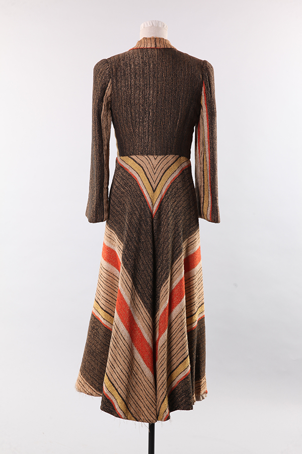 在二戰(zhàn)后的很多年中,女性擁有一件時尚大衣非常重要。制服影響時尚,尤其是軍裝元素被吸收到日常男女時裝中。因為戰(zhàn)時材料短缺的影響慢慢減少,皮草特別是貂皮大衣成為女性地位的終極象征。圖中的大衣最重要的一點是足夠的長度,能夠蓋住里面連衣裙或者半裙的下擺,這件大衣還有束緊的腰圍和喇叭形下擺。
