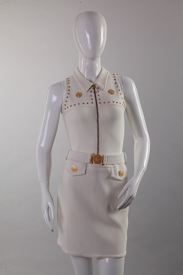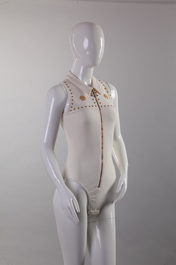 緊身連衫褲(Bodysuit),是一種覆蓋軀干及胯部的一件式合體衣, 流行于20 世紀(jì)八九十年代。緊身鏈衫褲和其他品類服裝的結(jié)構(gòu)區(qū)別在于,底襠處用欽紐、鉤袢閉合。這種緊身鏈衫褲不同于雜技或體操用專業(yè)運(yùn)動服,普通女性多將其用作內(nèi)衣、一般運(yùn)動裝或打底衫,并與裙、褲搭配使用。這件白色針織套裝包括襯衫領(lǐng)緊身連體褲及A 型短裙,是由成立于1995 年的美國紐約的品牌“馬斯科尼”出品。