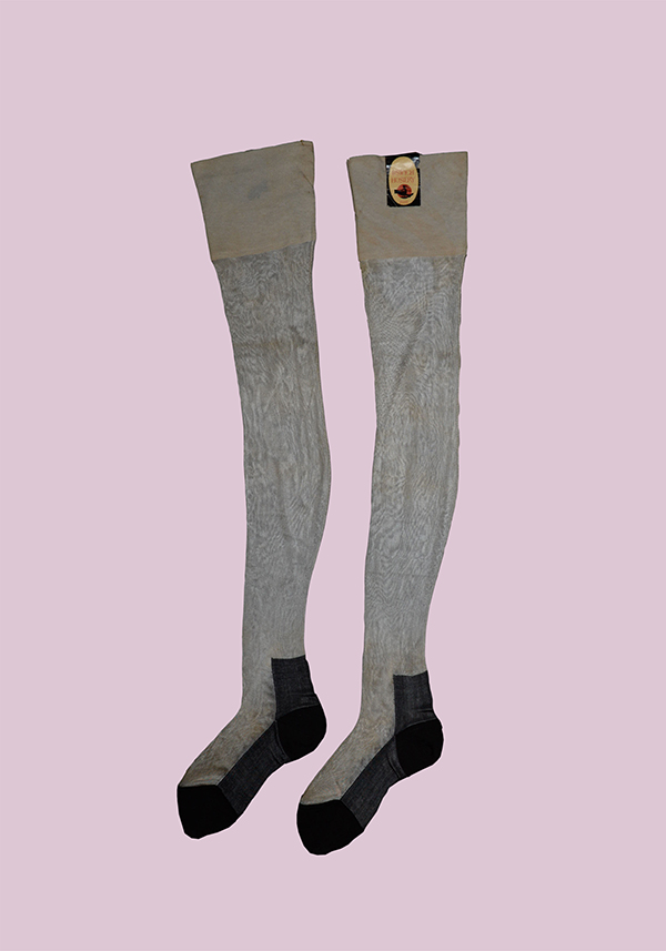 伊普斯維奇針織工廠建立于1868年,到20世紀(jì)初已經(jīng)成為美國最大的長襪廠。這件藏品在襪底和襪口用加厚的棉織物,襪腿用透明的人造絲材質(zhì)。