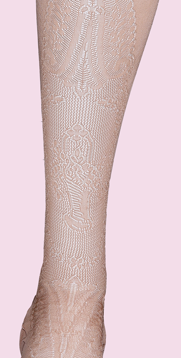 花籃紋蕾絲真絲長筒襪,出品自美國喬丹馬什公司,該公司成立于1861年,是梅西百貨的前身。襪子正面的鏤空紋樣精致,襪子前端有“Jordan Marsh & Company ”等字樣。