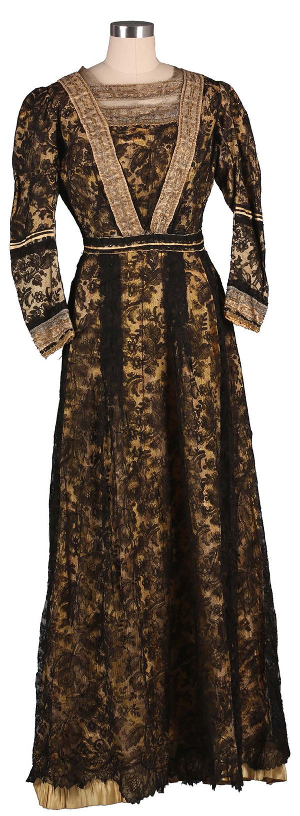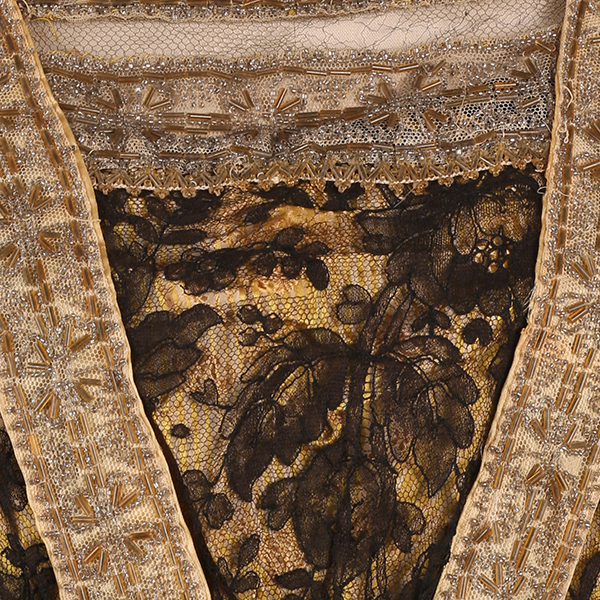 通體蕾絲服飾,內(nèi)已縫制好襯裙,可以直接套穿。植物花卉紋蕾絲面料非常輕薄通透,可看到內(nèi)部黃色襯裙,并在領(lǐng)口、胸前及袖口位置裝飾釘珠,增添了華麗感。