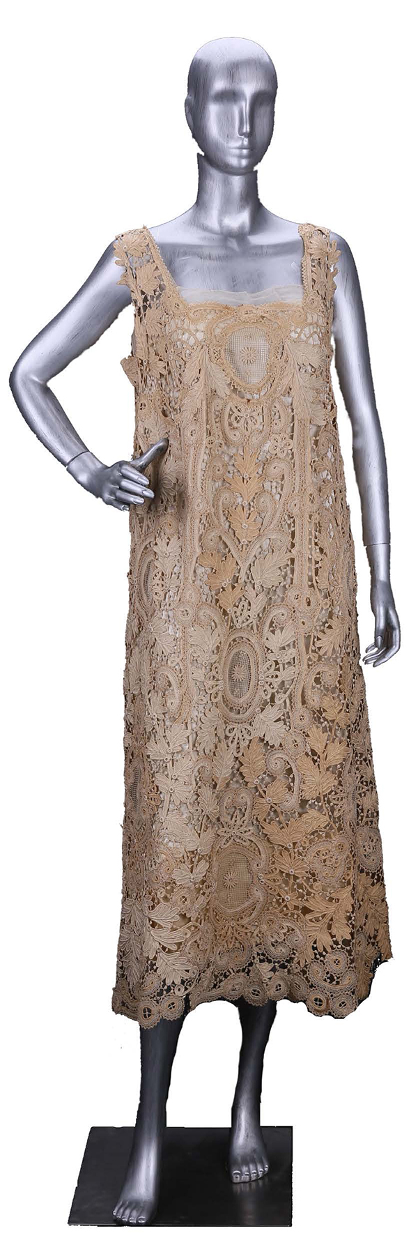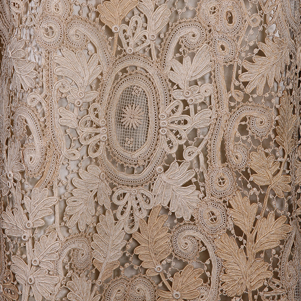這件連衣裙由一片片植物紋蕾絲拼接而成,單片蕾絲較為厚重,立體感強,浮雕效果明顯。里面已搭配好襯裙,可以直接套穿。