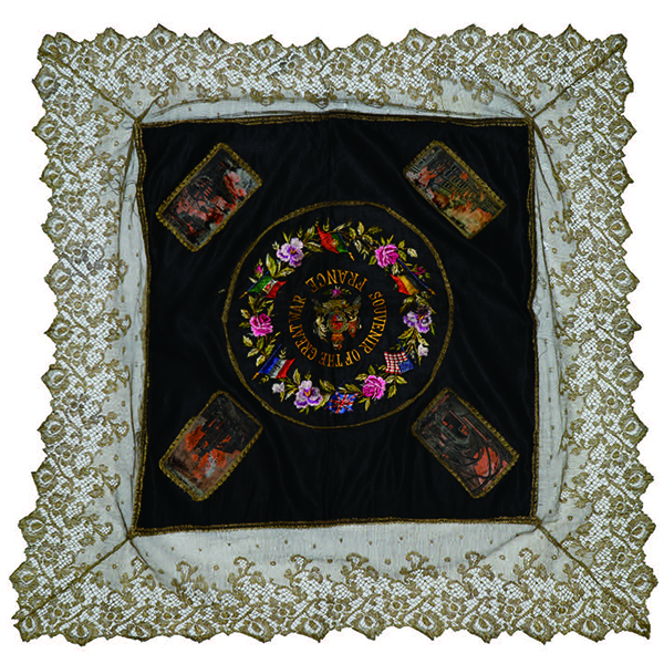 金屬線編織蕾絲,裝飾于掛飾邊緣,中心黑色金絲絨面料上刺繡彩色花環(huán),四角裝飾戰(zhàn)火中建筑的畫面?;ōh(huán)及四角的畫面均有金屬線蕾絲裝飾,與整件的蕾絲邊飾遙相呼應(yīng)。掛飾中心的英文寫有“souvenirofthegreatwar”,是為了紀(jì)念一戰(zhàn)的勝利。