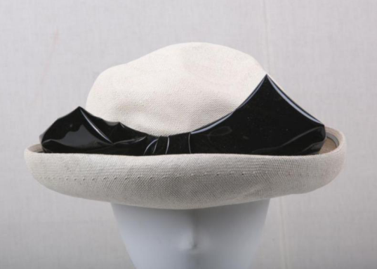 夏帕瑞麗品牌服飾用色強烈、裝飾奇特。此頂草帽黑白兩色對比強烈,白色的草編材質(zhì)與黑色的漆皮材質(zhì)也形成了質(zhì)感的碰撞。黑色大朵漆皮蝴蝶結(jié)造型非常時尚。