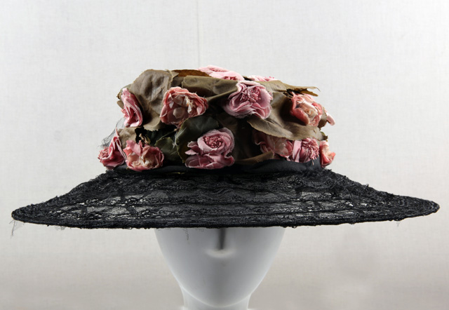 帽身布滿了布藝粉紅色的大朵花卉及綠色樹葉,非常逼真。寬大的帽檐采用黑色網(wǎng)紗材質(zhì),粉、綠的花卉樹葉帽身與黑色的網(wǎng)紗帽檐形成繁簡虛實對比。色彩搭配上也有較強的視覺沖擊力。