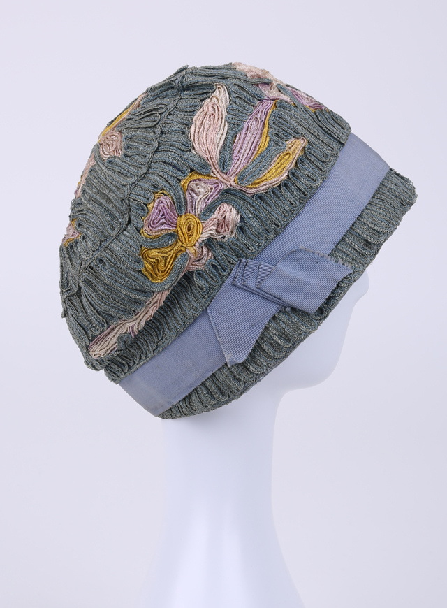 工藝較為獨特,采用條狀藍(lán)色草編堆疊而成,同時點綴粉、紫、黃色編織花卉紋。帽身邊緣處裝飾天藍(lán)色緞帶,無帽檐的設(shè)計讓佩戴者更多了一絲柔媚的美感。