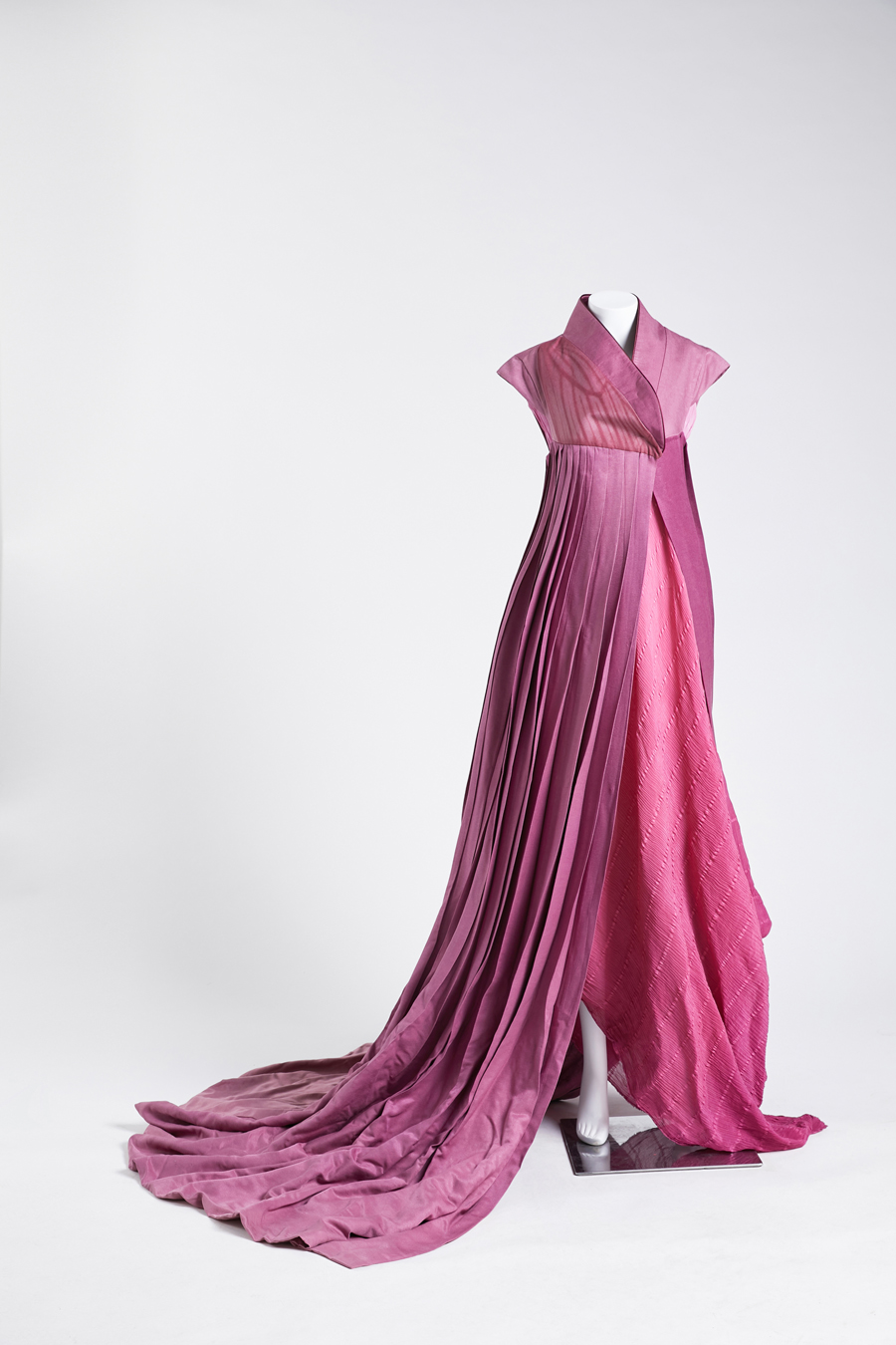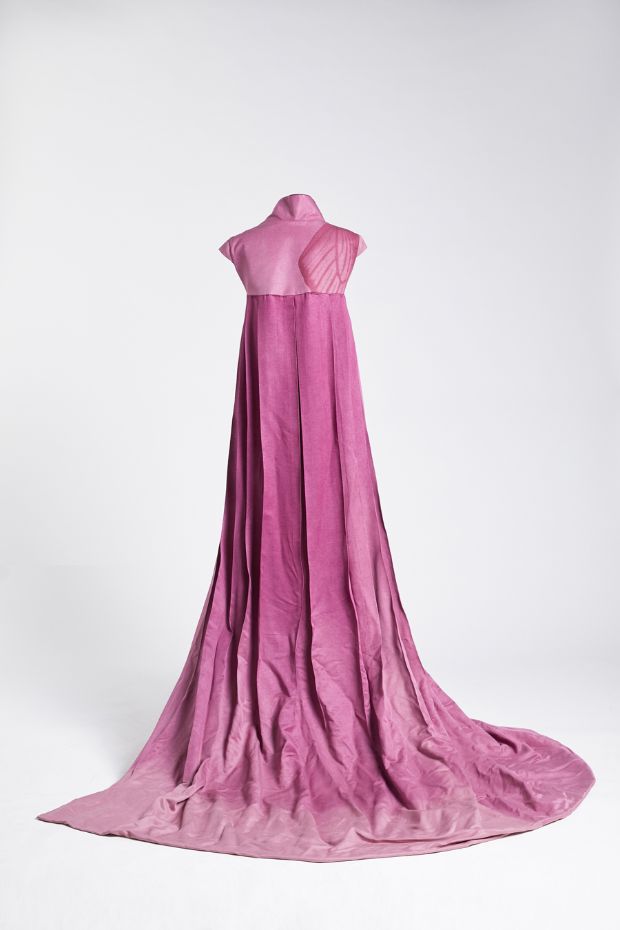 “飛行”表達(dá)了設(shè)計師“放開心態(tài)以重新認(rèn)識并改變自我”的愿景。旗袍采用天然材料、絲綢和歐根紗,交替使用以交集和平衡旗袍的密度和透明度、重與輕之間的關(guān)系。旗袍以特殊技術(shù)和縫紉技法創(chuàng)造出褶皺,體現(xiàn)了旗袍的立體感。裙上的印花則是在詮釋“詩意之航”的主題。印花的蝴蝶是生活在中國的特定品種。在設(shè)計師看來,美麗的大自然可以最真實(shí)地反映人的靈魂,因此選擇了以花間翩翩的蝴蝶作為裙上圖樣。