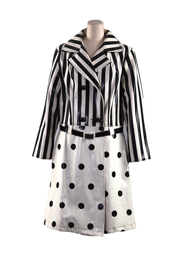 在20世紀(jì)60年代波普藝術(shù)運(yùn)動(dòng)影響下,條紋、波點(diǎn)等幾何圖案成為流行的服裝 面料圖案。此外,隨著阿波羅登月成功,太空風(fēng)格也成為20世紀(jì)60年代流行潮流的一支,人造革、樹(shù)脂材料隨之應(yīng)用于服裝及配飾中。此件雙排扣、翻駁領(lǐng)中長(zhǎng)大衣即為上述流行的印證 。