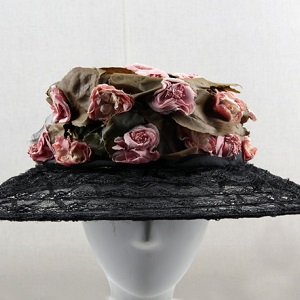 布藝立體花卉樹葉裝飾黑色網(wǎng)紗寬檐帽