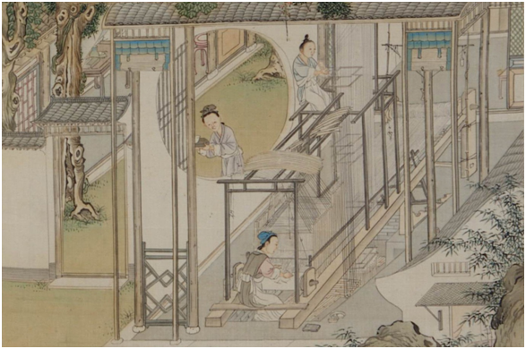 Image: Detail of weaving on a drawloom, Sericulture Illustrations by Wu Qi, Qing Dynasty. China National Silk Museum, Hang Zhou.