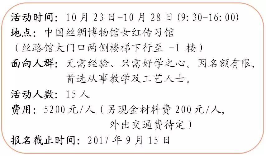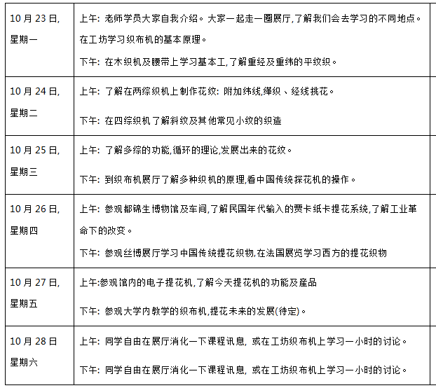 六天的研習(xí)班, 將結(jié)合織布機(jī)上體驗(yàn)、實(shí)物觀察、展廳觀覽、車間考察的多元學(xué)習(xí)。目標(biāo)是通過(guò)深入淺出的解讀,使學(xué)員明白織布機(jī)上花紋的多種發(fā)展,欣賞成品,了解從古代、民族織機(jī)到今天電子提花機(jī)的發(fā)展。