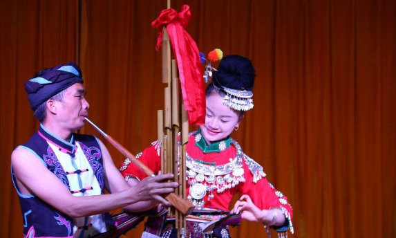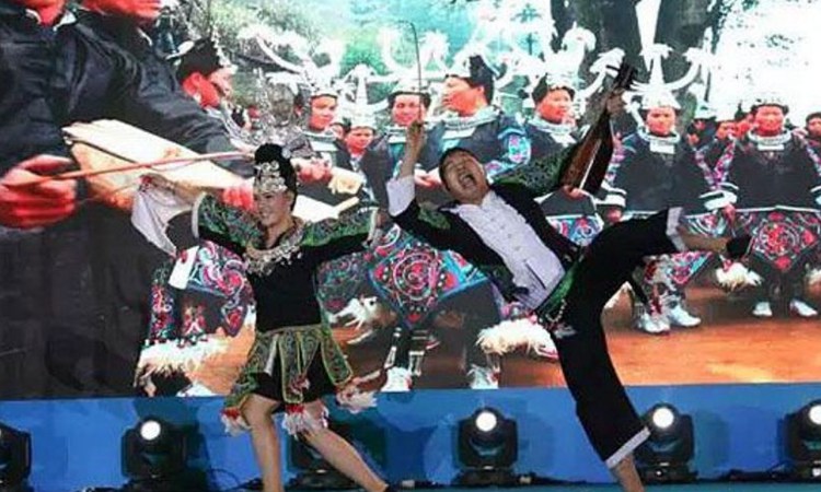 “古瓢琴”是苗族人民特有的一種古老的民間傳統(tǒng)樂器,古瓢琴舞則是苗家男女老幼喜愛的一種獨(dú)特的娛樂形式。舞蹈糅合著苗族人民對(duì)生活和愛情的美好向往,表現(xiàn)形式獨(dú)具特色,是難得一見的苗族民間藝術(shù)的珍品。