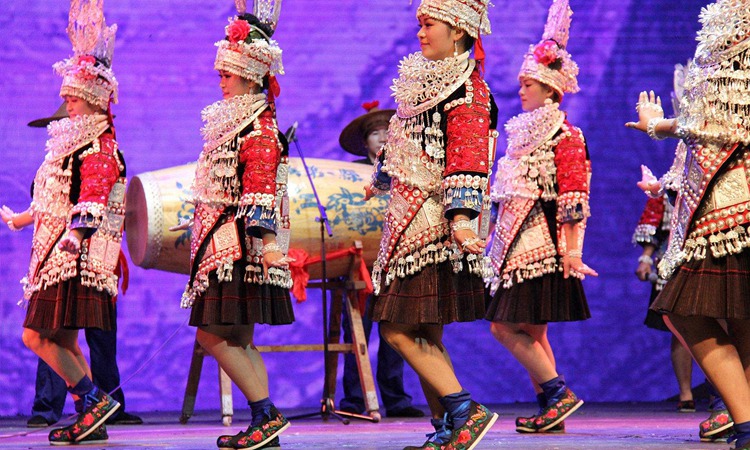 踩鼓是苗族特有的民俗節(jié)慶活動(dòng)形式,在貴州黔東南苗族地區(qū)廣為流傳,是苗族“姊妹節(jié)”上必不可少的女子群舞。姑娘身著盛裝、披掛銀飾,列隊(duì)圍成圓圈,踏著鼓點(diǎn)起舞,場(chǎng)景熱烈,情緒歡騰。