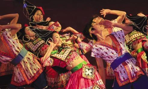 花帶是苗家女孩親手繡制的繡品,在游方場(chǎng)上,哪個(gè)苗家小伙的蘆笙吹得最好,飛歌唱得最好,女孩就把花帶系在花帶上,以此定情。舞蹈表現(xiàn)的正是苗家男女談情說愛的場(chǎng)景。