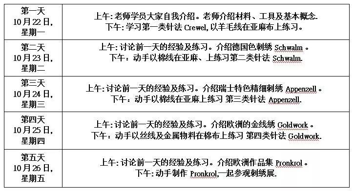 五天的研習(xí)班, 結(jié)合動手體驗、實物觀察、展廳觀覽、互動交流的多元學(xué)習(xí),目標(biāo)為深入淺出地了解歐洲刺繡技法及文化。歡迎大家?guī)Р煌汤C實物來分享交流。課程以英語教學(xué), 配有普通話翻譯。
