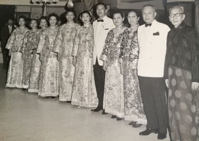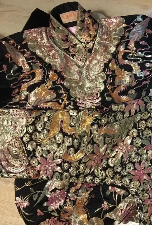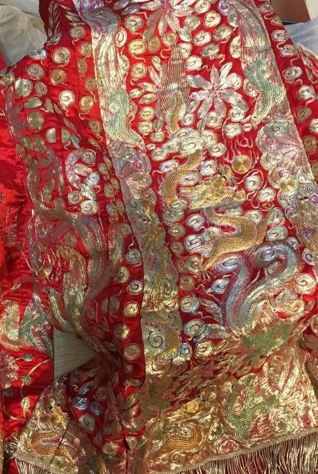 六十年代每逢節(jié)日慶典, 廣東大戶人家的已婚婦女都會穿上金銀線盤繡的裙掛。上衫黑緞面料,半腰裙紅,鋪滿金銀線。
