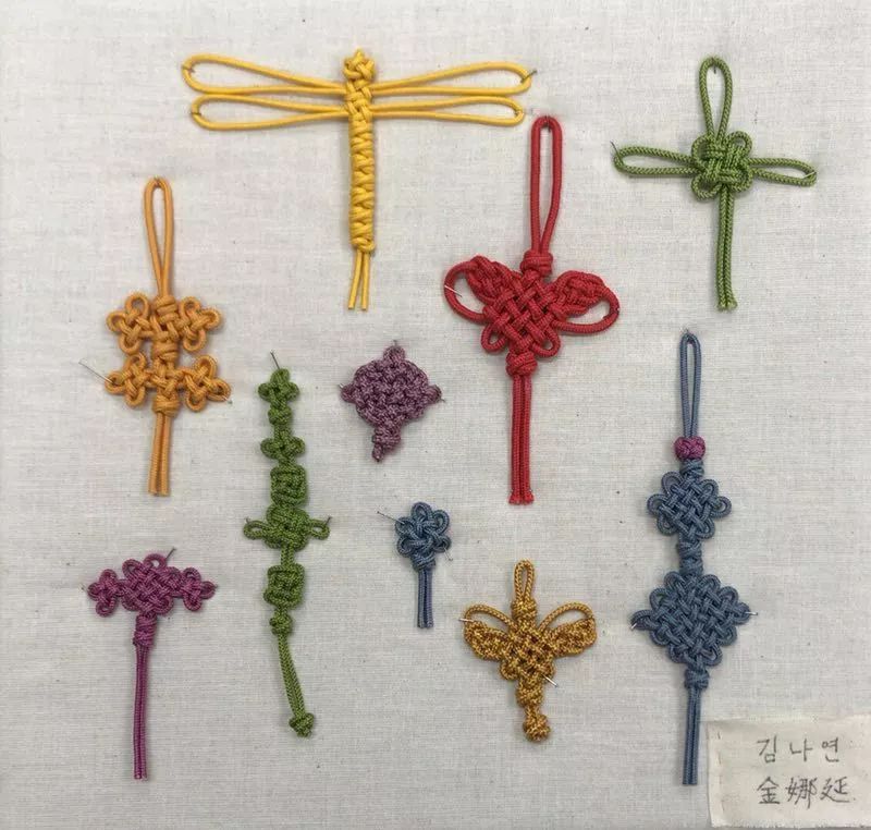 結(jié)是使用繩子打出多樣形狀結(jié)的工藝,在韓國打結(jié)使用的繩稱為“多繪”。韓國的打結(jié)工藝材料為絲線,有33種多樣“結(jié)”,前后一樣、左右對稱、垂直連續(xù),適用于佩飾、腰帶、流蘇、囊等。