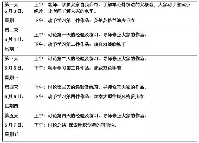 費(fèi)用:4500元/人(另需現(xiàn)金材料費(fèi) 600元/人,包括進(jìn)口高級(jí)羊毛線、教材及織針等工具)