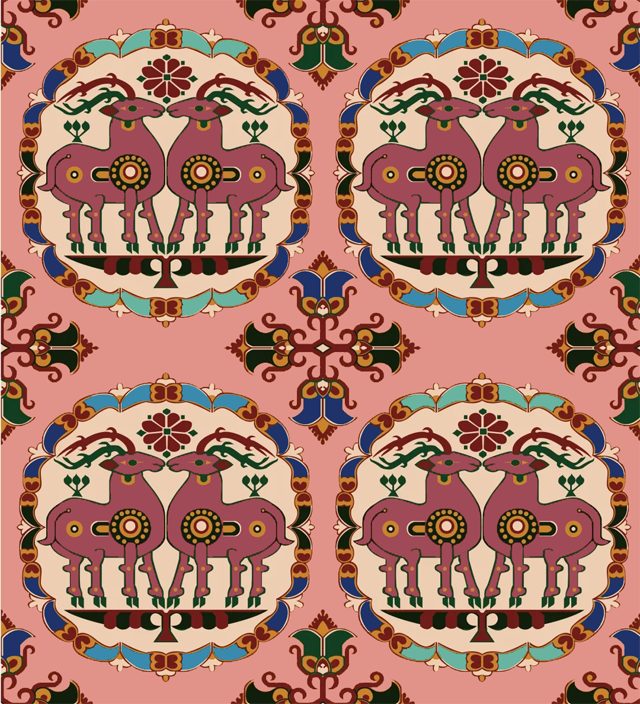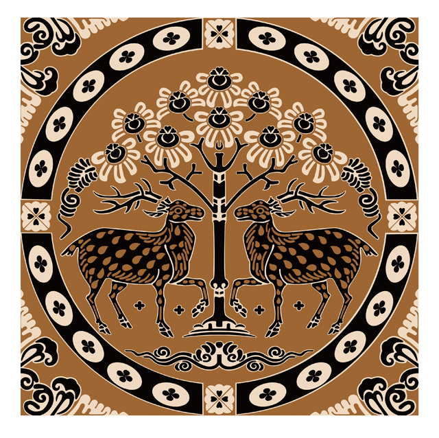 “花樹對(duì)鹿”這一主題的紋樣帶有鮮明的中亞、西亞風(fēng)格。尤其是鹿的大角和鹿項(xiàng)系的綬帶。中、晚唐后鹿角隨意,項(xiàng)上無(wú)綬帶的本土化特征逐漸明顯,此夾纈上的“鹿”明顯為具有東方風(fēng)格的梅花鹿。
