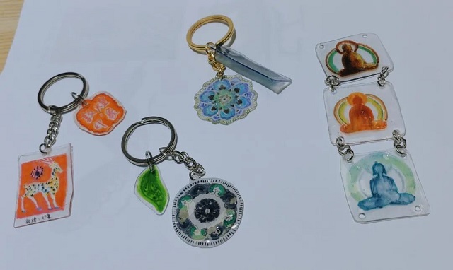 熱縮片的質地與塑料相似,熱風一吹,就會變成原本的三分之一大小?;顒右远鼗图y樣為主題,利用熱縮片預熱縮小的特性,制作富有創(chuàng)意的“敦煌印象”小飾品。