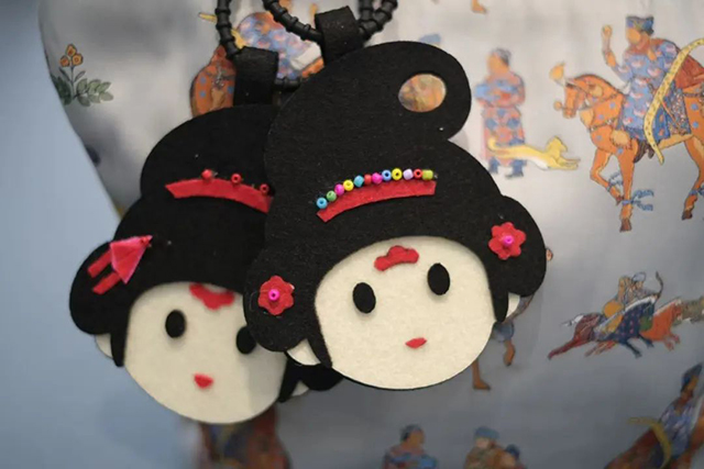 本次活動從“九天閶闔:絲綢之路上的長安”展覽中獲取靈感,以唐代人偶作為模板,利用珠子和不織布等材料進行拼貼、組合,形成一個個可愛的唐妝娃娃掛件。